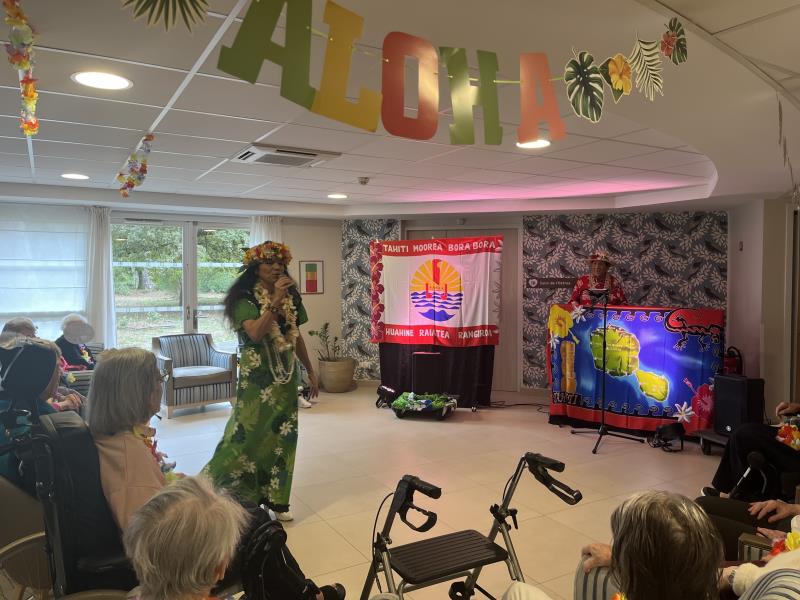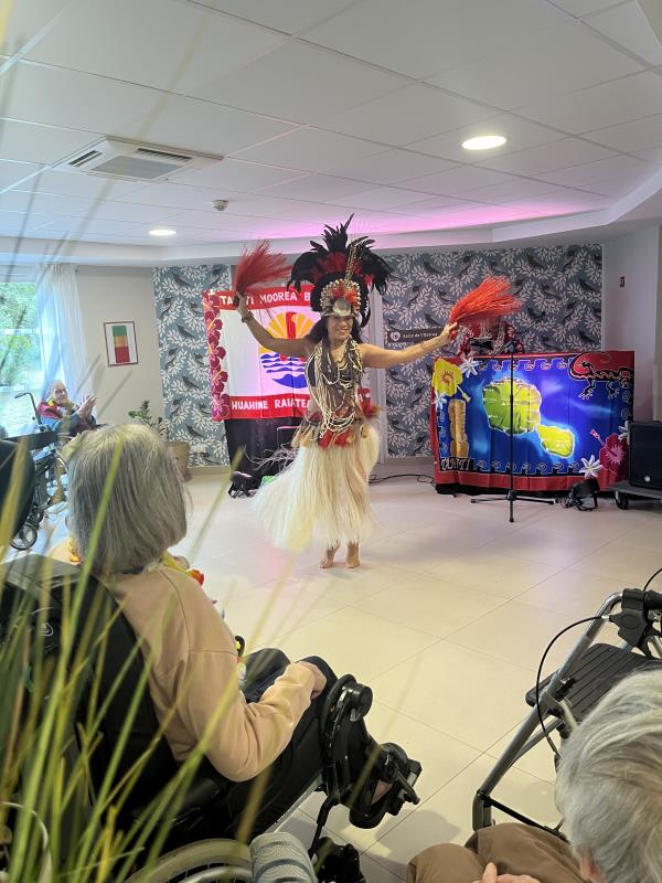 L’équipe de la résidence a offert une performance de danse tahitienne, avec costumes typiques et chants, qui ont captivé et enthousiasmé les participants.
